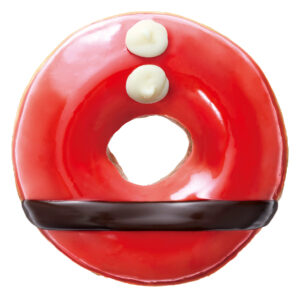 サンタの服がドーナツになりました。 ミルキーなホワイトチョコのベースに甘酸っぱいストロベリーナパージュを被せて、 ホワイトチョコのボタンとほんのりビターなチョコのベルトを飾りました。 サンタやベアと一緒に並べたら、サンタ姿が完成!