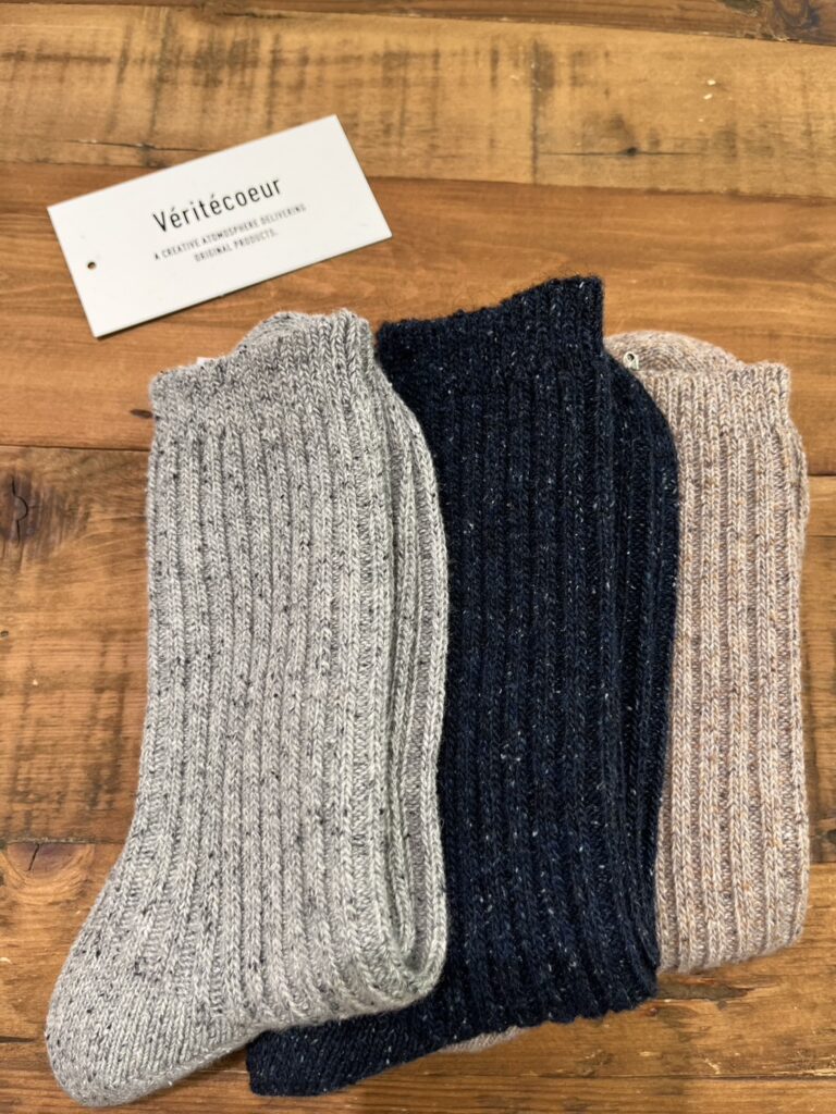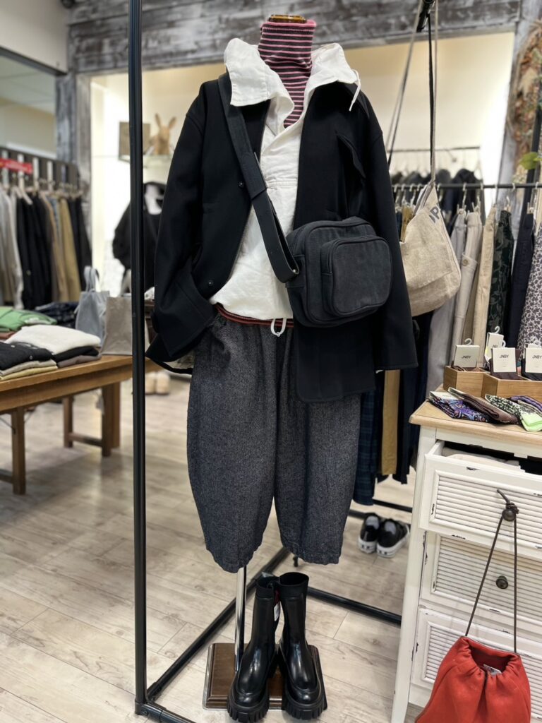 シックな色が映えるコーデに、ふっくらとウォーム感のあるソックスや、しっかりとした生地のバッグを添えて。