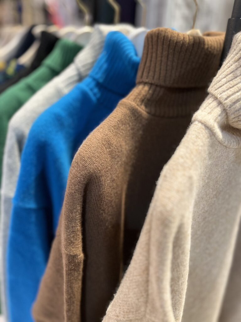 インナーには、鮮やかな色のニットを合わせても素敵です。